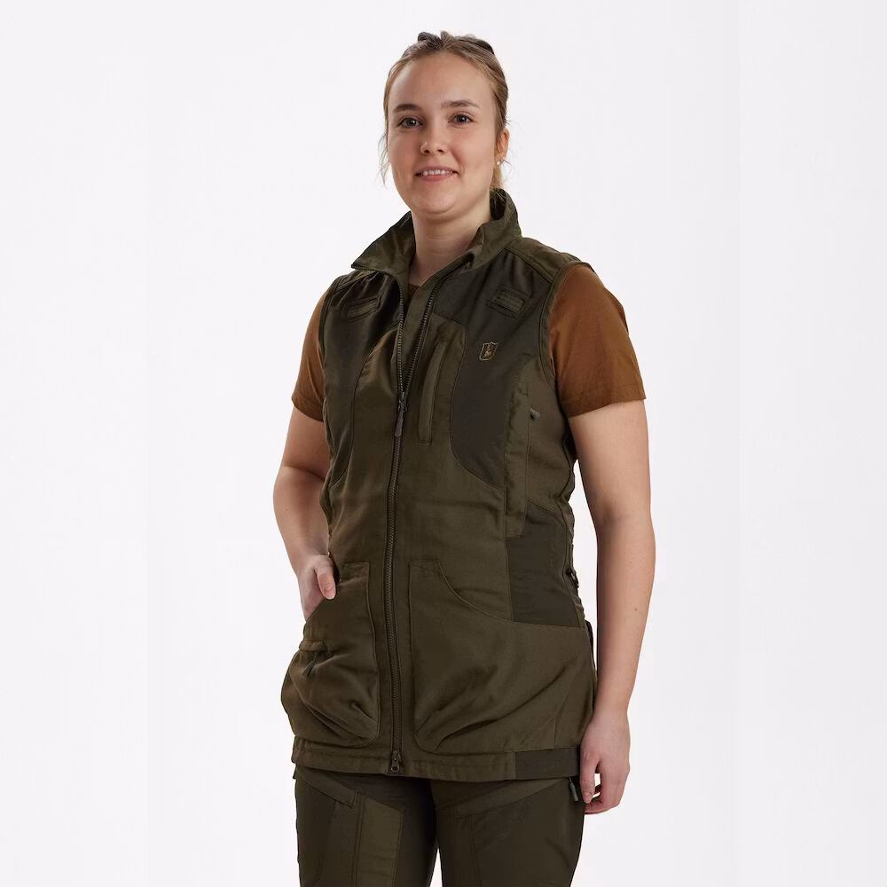 Deerhunter Lady Ann Extreme Waistcoat är perfekt för friluftsentusiasten och den ivriga jägaren och är fullpackad med funktionella funktioner som en mängd välplacerade fickor och hållare som är idealiska för att bära vilt och jakthundsträningsartiklar. Vattenavvisande, med Deerhunters signatur 4-vägsstretch, den är gjord för aktiva aktiviteter i naturen och designad för att tåla våta väderförhållanden. Med en justerbar dragsko i midjan och nederkant ger den en smickrande feminin passform.