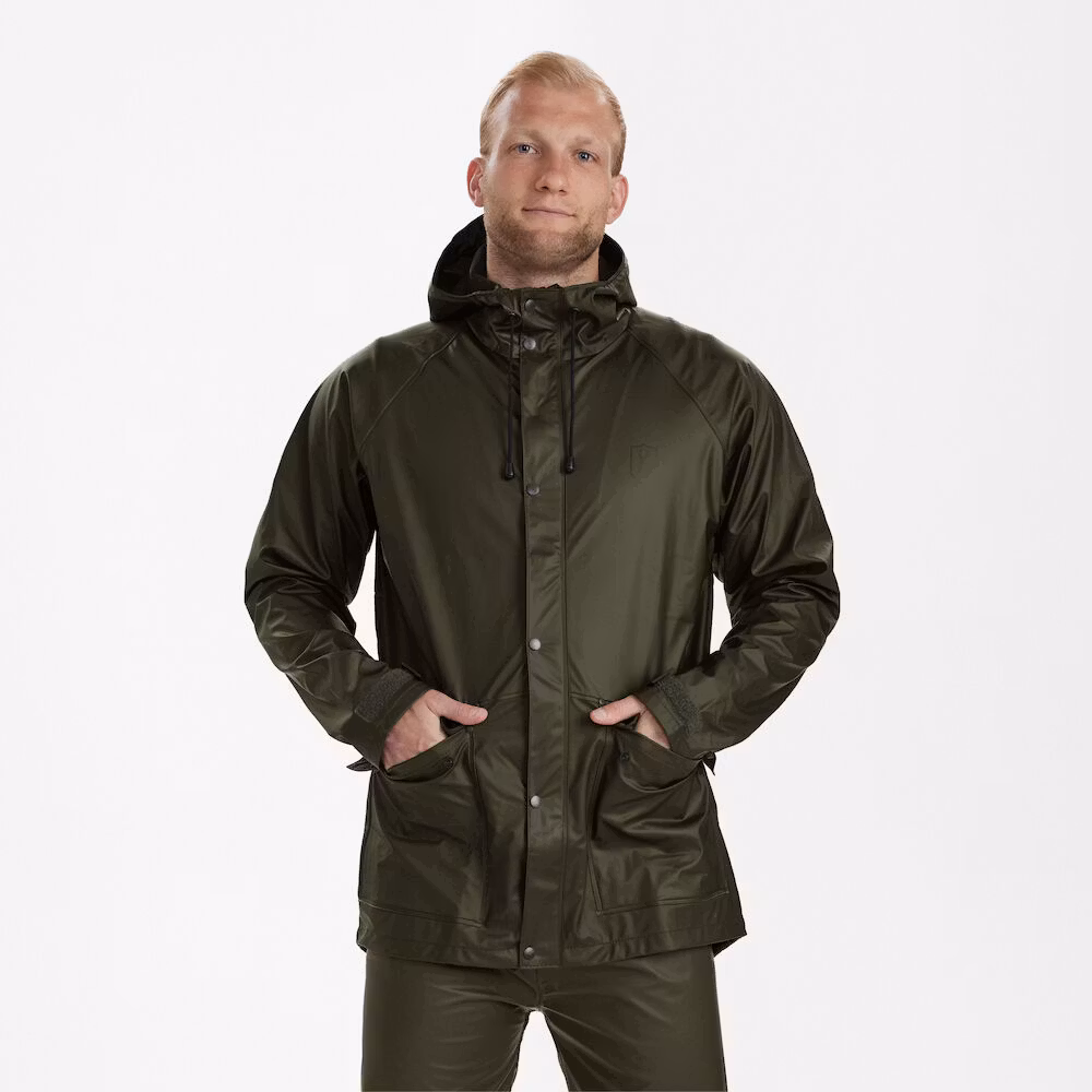 Regnjacka med huva och ventilation i ryggen - 100% vattentät! Regnjacka med huva i enfärgad grön och med PU-beläggning. Framfickor med knappar och ventilation i ryggen. Kan maskintvättas.