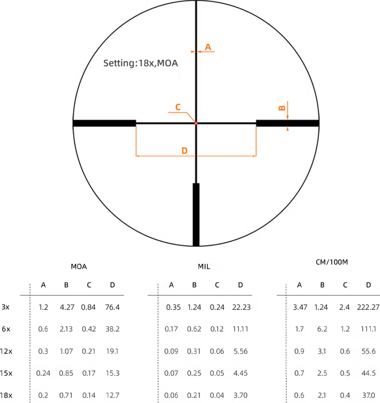- German #4 Fiber SFP-retikel: Det etsade riktmedlet (German #4-inspirerat) är placerat i det andra fokalplanet (SFP), vilket innebär att dess storlek förblir konstant oavsett zoominställning. Den fiberbelysta mittpunkten med 6 nivåer av röd belysning är mycket synlig i alla ljusförhållanden.