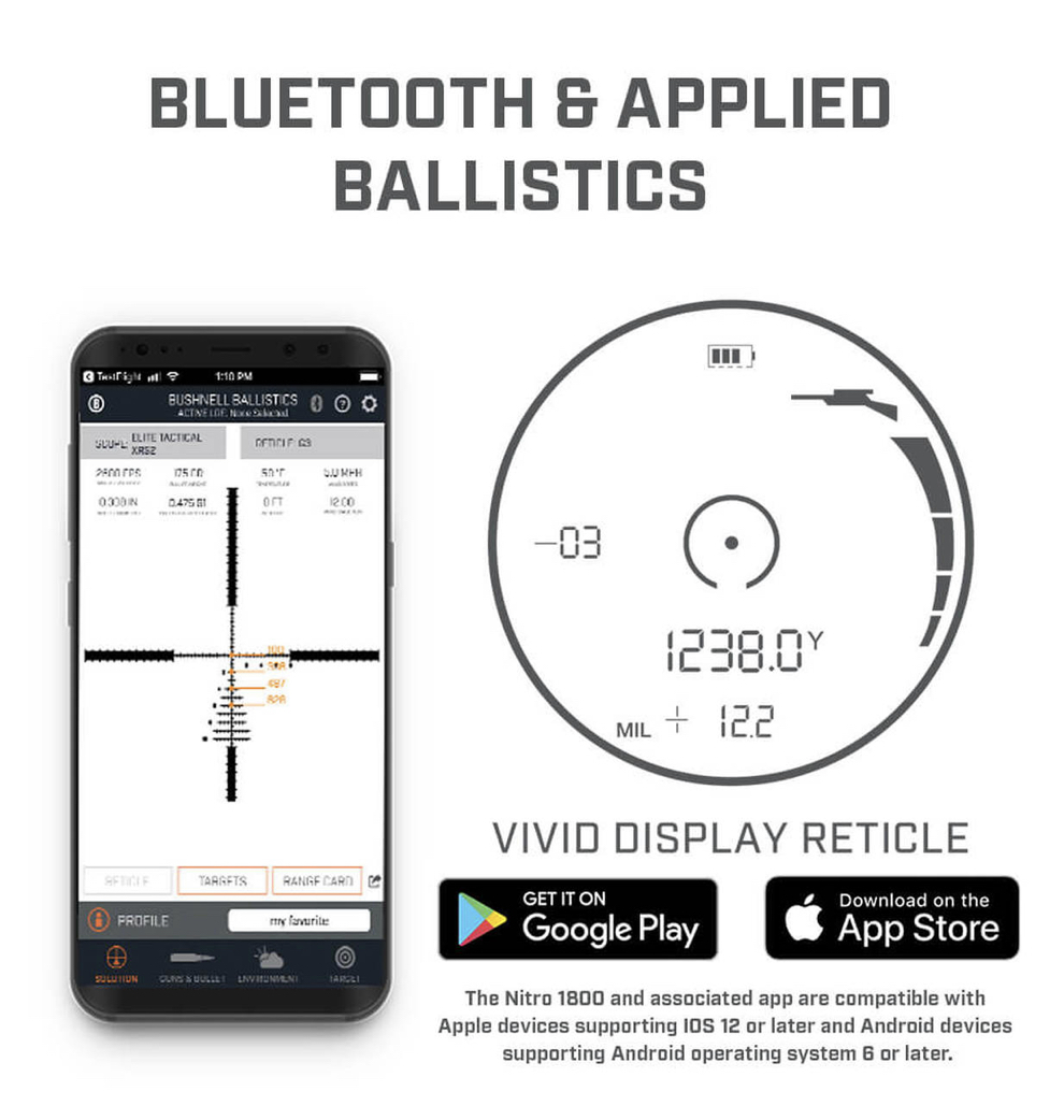 Nitro 1800 är en kraftfull avståndsmätare kombinerar mjuk- och hårdvara för att exakt beräkna träffläge i svåra situatioener. Med Bluetooth-anslutning kan man länka samman avståndsmätare, Kestrel vindmätare och appen Applied Ballistics®. Denna iphone/android-app beräknar kulbanan efter givna förutsättningar (avstånd, kulbana, vind, temperatur, lutning mm.) och beskriver direkt hur många knäpp man ska skruva eller vart man ska hålla i målet.