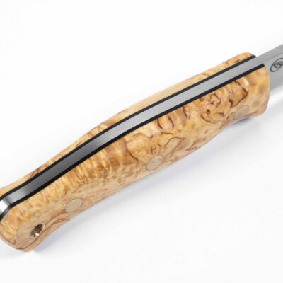 • Knivblad av det rostfria knivstålet 14C28N från svenska Sandvik, ett stål som efter en specialhärdning håller skärpan bra även vid hård användning t ex vedklyvning.