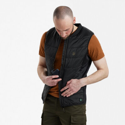 Deerhunters Heat väst har ett integrerat HEAT-system som aktiveras på västens vänstra sida med ett enkelt tryck. Det är möjligt att justera värmegraden på västen, vilket syns på den inbyggda LED-ljuset som indikerar västens tre värmelägen.Västen kommer med dragkedja på framsidan, samt en flexibel kvalitet på båda sidorna som säkerställer en hög rörelsefrihet och komfort.