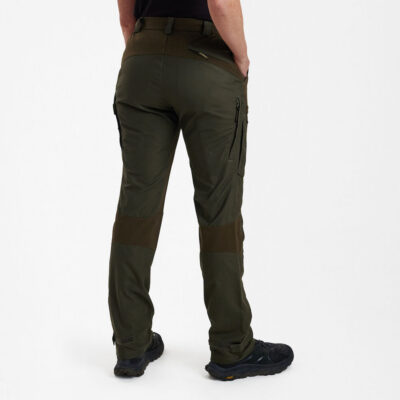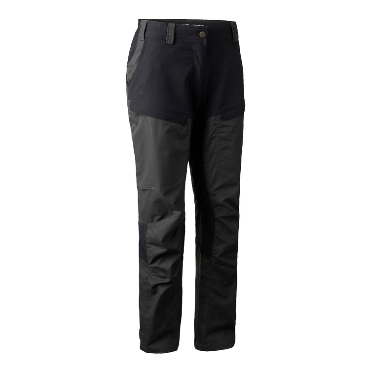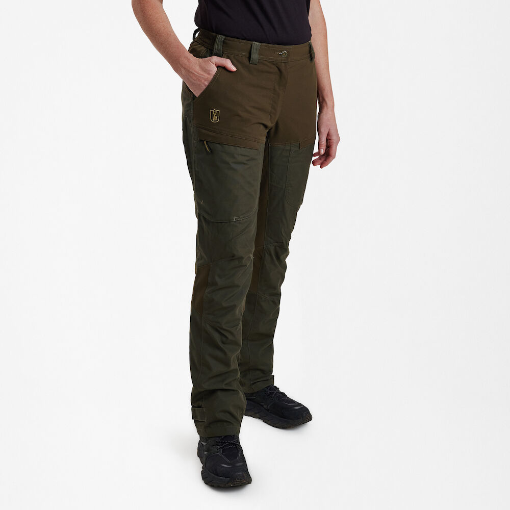 DEERHUNTER Lady Ann byxor med Deer-Tex®-membran är tekniska byxor som är designade för seriösa äventyr. De ger optimalt skydd mot alla väderförhållanden och passar perfekt till resten av Lady Ann-kollektionen. Vattentäta, vindtäta och extremt andningsbara med extra 4-vägs stretch för ökad rörlighet. De är idealiska för aktiva jakter. Det finns gott om förvaringsutrymme för allt nödvändigt, inklusive en säker knivficka. De har förformade knän, elastik i midjan, ventilationsdragkedjor och justerbara ankelstängningar som ger en perfekt passform.