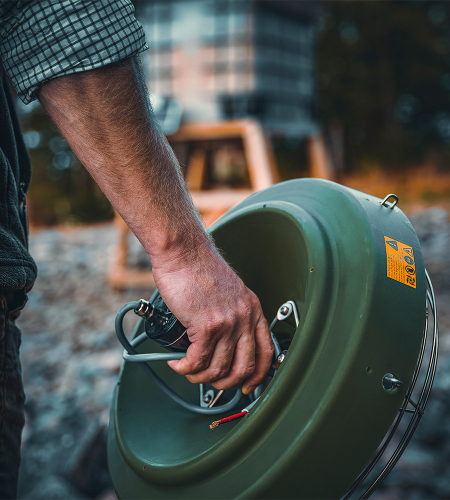 Den kraftfulla motorn sprider fodret upp till 30 m i diameter och sitter på insidan av behållaren för att skydda motorn.