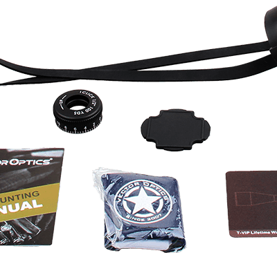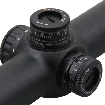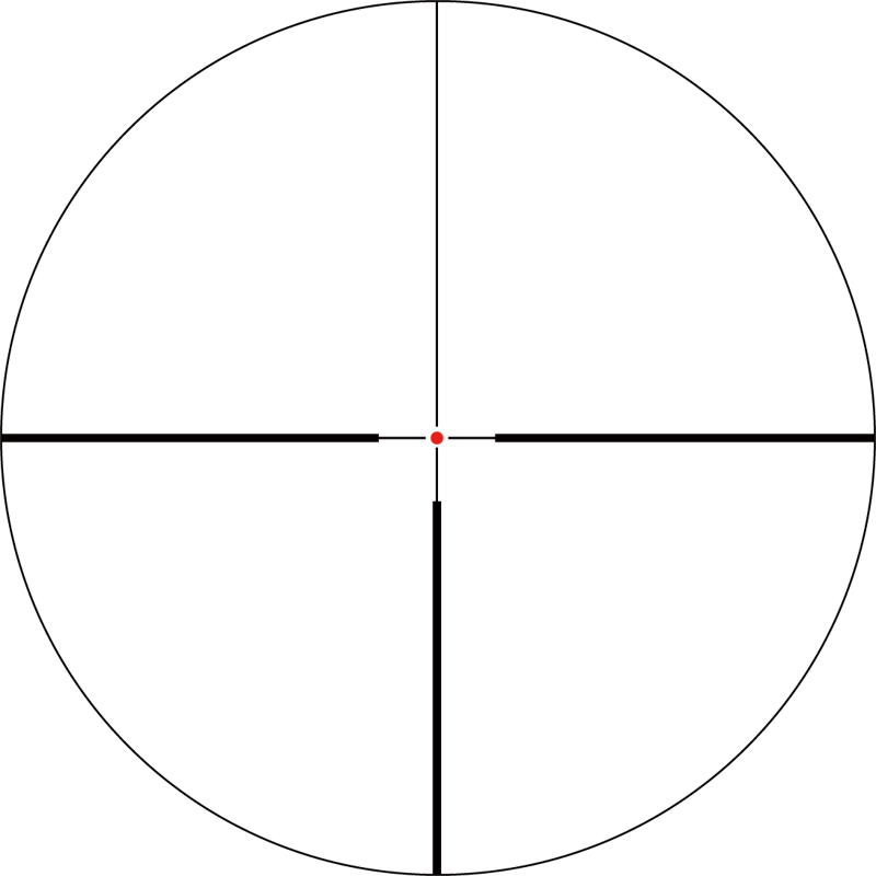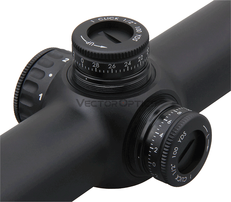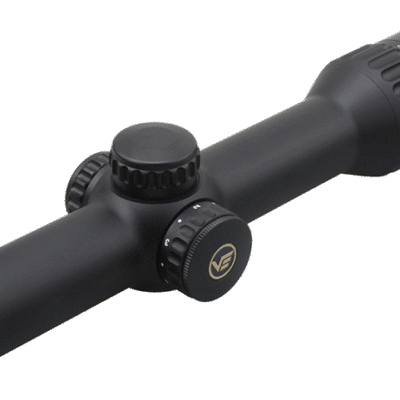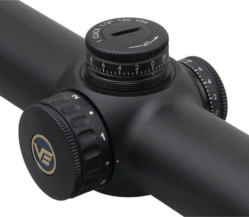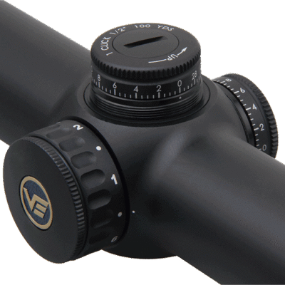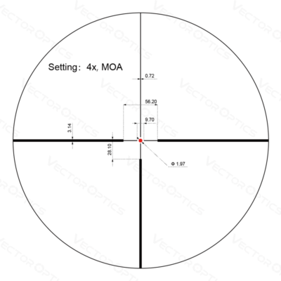 - VCO-7MIL SFP-retikel: Det etsade riktmedlet (VCO-7MIL) är placerat i det andra fokalplanet (SFP), vilket innebär att dess storlek förblir konstant oavsett zoominställning. Den belysta mittpunkten har 6 nivåer av röd belysning.