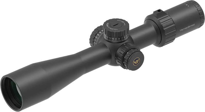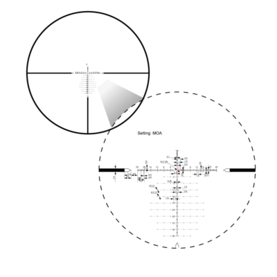 - FFP VTA-4 MOA-retikel: Det etsade riktmedlet sitter i det första fokalplanet (FFP), vilket innebär att avståndsmåtten i retikeln förblir korrekta oavsett zoomnivå. Det har en fin 0,125 MOA-mittpunkt och 2 MOA hashmarkeringar för exakt målinriktning och snabba håll.